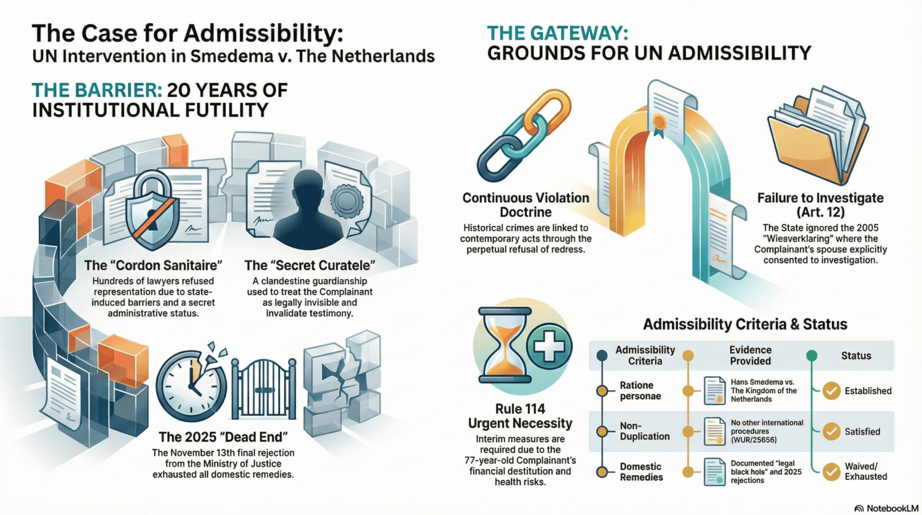 The Committee should find this communication admissible under the “ineffectiveness of domestic remedies” exception. The Complainant has provided a 20-year evidentiary trail proving the Dutch legal system is unwilling to provide an impartial forum. Without UNCAT intervention, the Complainant remains in a state of legal non-existence, denied the very protections the Convention was designed to enforce.
