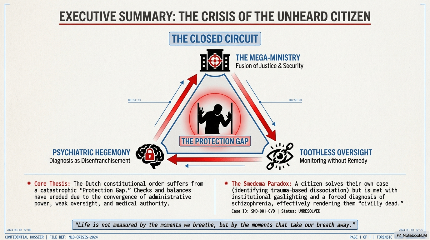 The core thesis of this investigation is that the Dutch constitutional order suffers from a catastrophic “protection gap.” The checks and balances designed to safeguard the individual against the state have been eroded by the amalgamation of the Ministry of Justice and Security (JenV), the toothless nature of intelligence oversight, and the epistemic arrogance of the psychiatric profession. This convergence has created a “closed circuit” where a citizen alleging state-sponsored crime can be effectively neutralized—stripped of legal agency, credibility, and dignity—through the weaponization of administrative law and the imposition of psychiatric diagnoses such as “delusional disorder.”