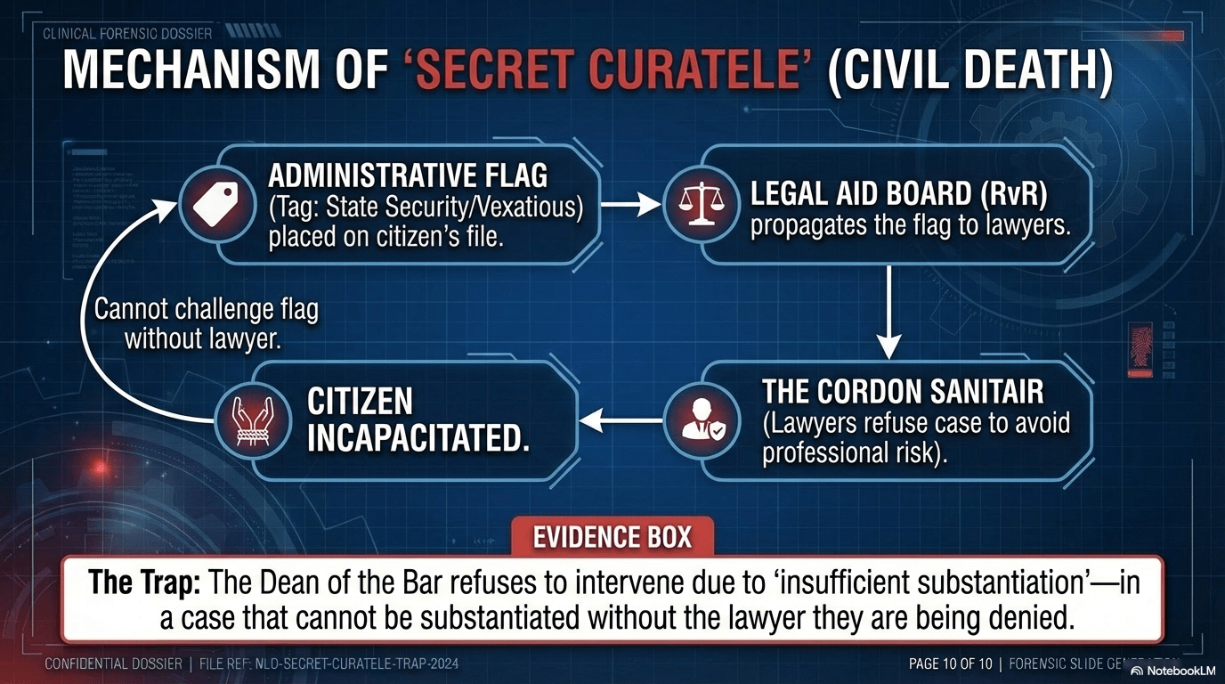 The consequences of this centralization extend beyond policing to the very legal existence of the citizen. The Smedema case introduces the concept of “Secret Curatele” (clandestine guardianship) and the “Cordon Sanitair” of legal professionals. The complainant alleges a systemic refusal by hundreds of lawyers to take his case, purportedly due to a secret administrative status that renders him legally incapacitated or flagged as a state security risk.2