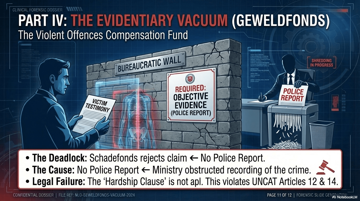 The Violent Offences Compensation Fund (Schadefonds Geweldfonds) was established to provide financial redress and recognition to victims of intentional violent crimes. However, its operating logic is fundamentally incompatible with cases of state-involved conspiracy or complex psychological trauma where the state itself controls the evidence.