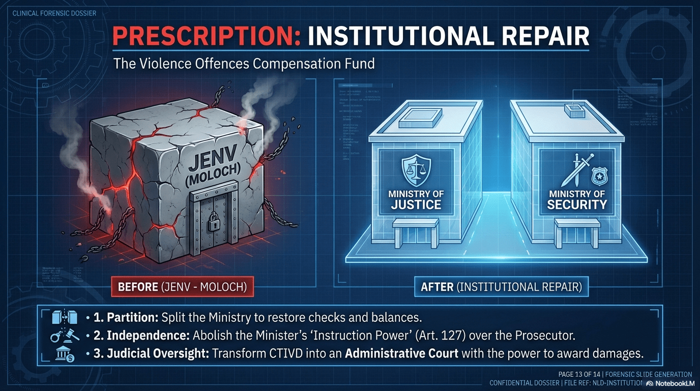The analysis proceeds in five comprehensive parts. Part I dissects the crisis of the “Mega-Department” (JenV) and the imperative for its administrative partition. Part II analyzes the failures of intelligence oversight (CTIVD) and the necessity for a judicialized remedy with full compensation powers. Part III constitutes the core of the report: a deep clinical-legal inquiry into the “fake professional psychiatrists,” the “diagnostic stalemate” between Schizophrenia and Dissociation, and the systemic ignorance that perpetuates injustices. Part IV examines the evidentiary blockades within the Violent Offences Compensation Fund (Geweldfonds). Finally, Part V provides a detailed blueprint for legislative and institutional reform, including the “Stichting” strategy and a stark warning to prevent future systemic injustices.