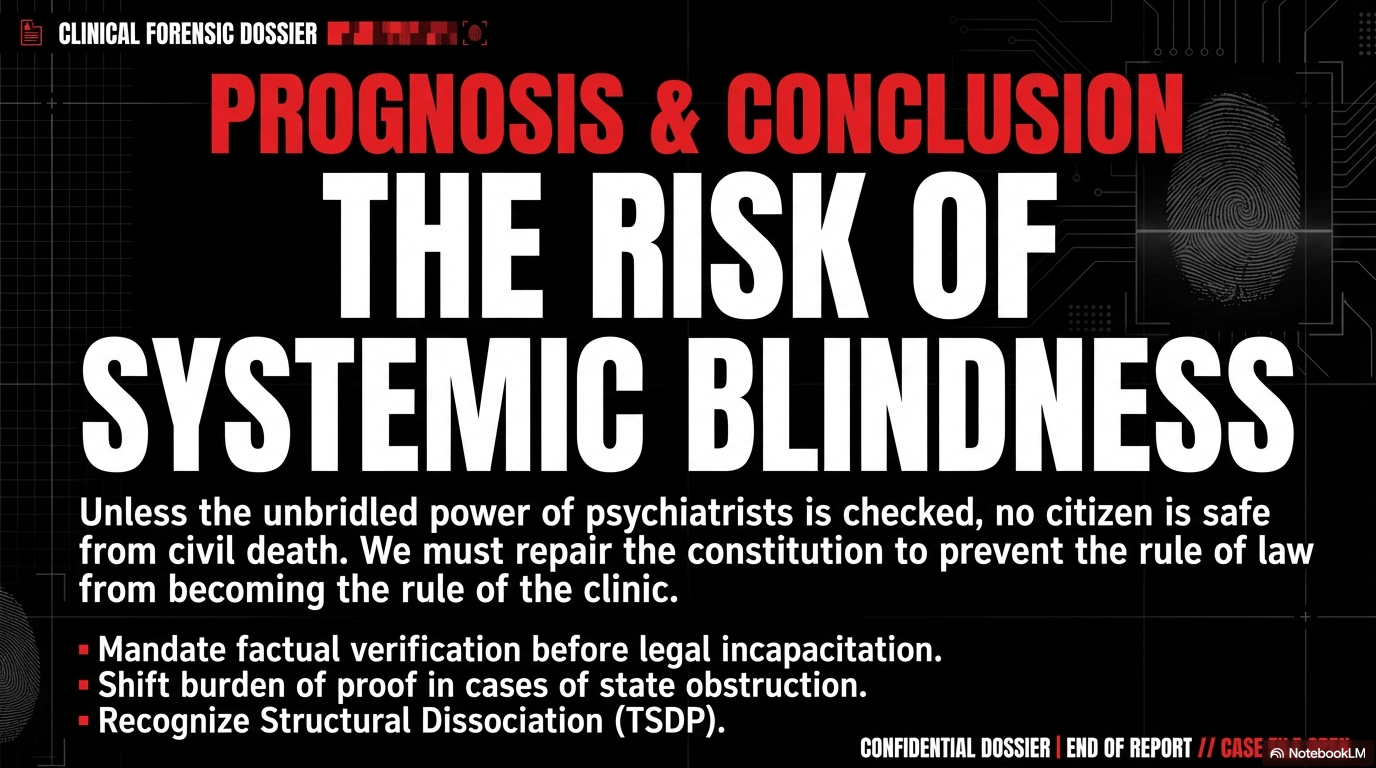 Warning: Unless the “unbridled power” of psychiatrists is checked by a requirement for forensic factual verification before a diagnosis of “delusion” can be legally valid, no citizen is safe from “civil death.” If a doctor can overrule a detective without leaving their office, the rule of law is replaced by the rule of the clinic.