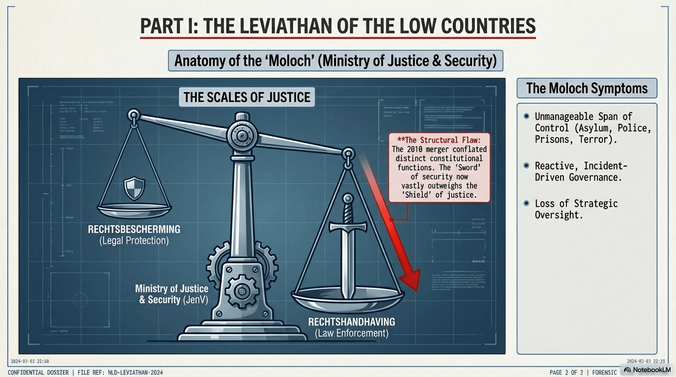 The governance of justice and security in the Netherlands operates under the shadow of a profound institutional experiment: the administrative amalgamation of 2010. This reform, which fused the classical Ministry of Justice with the public order and safety portfolios of the Ministry of the Interior to create the Ministry of Security and Justice (later renamed Justice and Security, JenV), marked a seismic shift in Dutch public administration. This institutional design, initially championed under the banner of New Public Management efficiency and a decisive, unified command structure against crime, has metastasized into what constitutional scholars and critics now term a “Moloch”—an ungovernable bureaucratic behemoth that structurally conflates the distinct constitutional functions of legal protection (rechtsbescherming) and law enforcement (rechtshandhaving).1