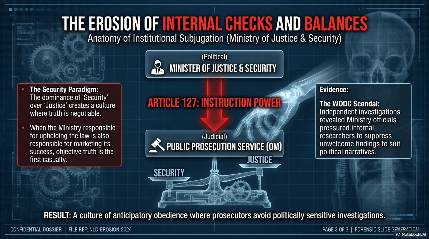 This lack of internal friction has led to the dominance of the “security” paradigm over the “justice” paradigm. The department’s culture has shifted towards maximizing executive power and minimizing legal obstacles. This cultural rot was starkly exposed by the “policy research under pressure” scandal involving the WODC (Research and Documentation Centre), the Ministry’s internal research institute. Independent investigations revealed that Ministry officials actively interfered with research conclusions to suit political narratives, pressuring researchers to suppress unwelcome findings about the efficacy of strict sentencing or drug policies.1 When the Ministry responsible for upholding the law is also the Ministry responsible for marketing the success of law enforcement, truth becomes a negotiable commodity.