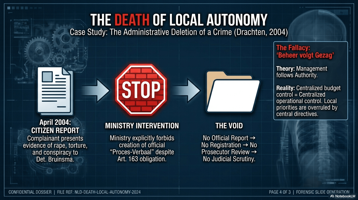 Although successive Ministers have claimed to use this power with extreme restraint, its mere existence acts as a “sword of Damocles.” It creates a culture of anticipatory obedience where prosecutors may shy away from politically sensitive investigations that could embarrass their political master or the Ministry’s own bureaucracy. In the context of the “Smedema Affair,” this structure is the likely mechanism behind the alleged obstruction. If a local detective in Drachten wished to investigate a complex, politically sensitive allegation involving high-ranking officials or state security matters, they would require resources and political cover. In a centralized system, a single instruction from The Hague can choke off these resources or explicitly forbid the creation of an official report (proces-verbaal), effectively overruling the local mandate to investigate.1