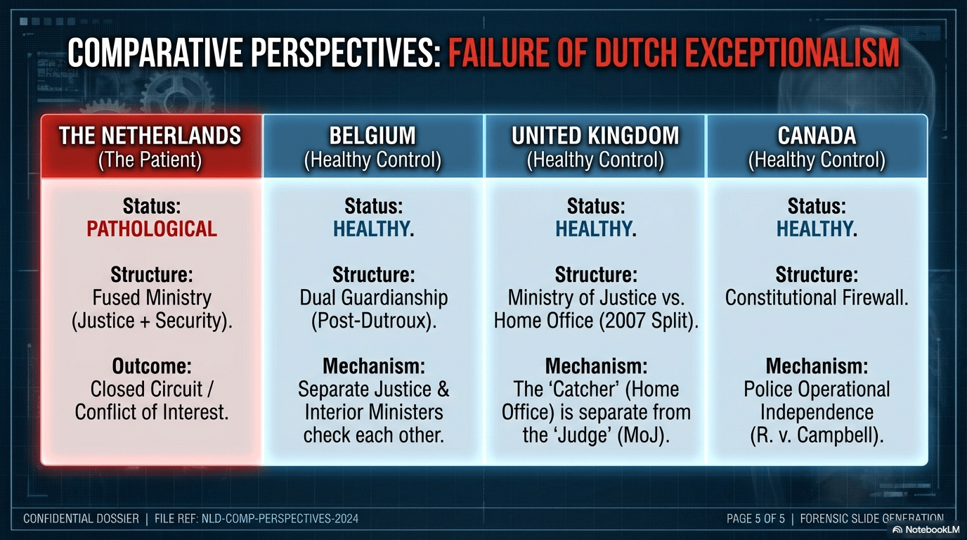 To understand the deviance of the current Dutch model, it is instructive to benchmark it against jurisdictions that have recognized the dangers of fusing Justice and Interior functions. The Dutch experiment in centralization stands as an outlier when compared to the checks and balances inherent in other parliamentary democracies.