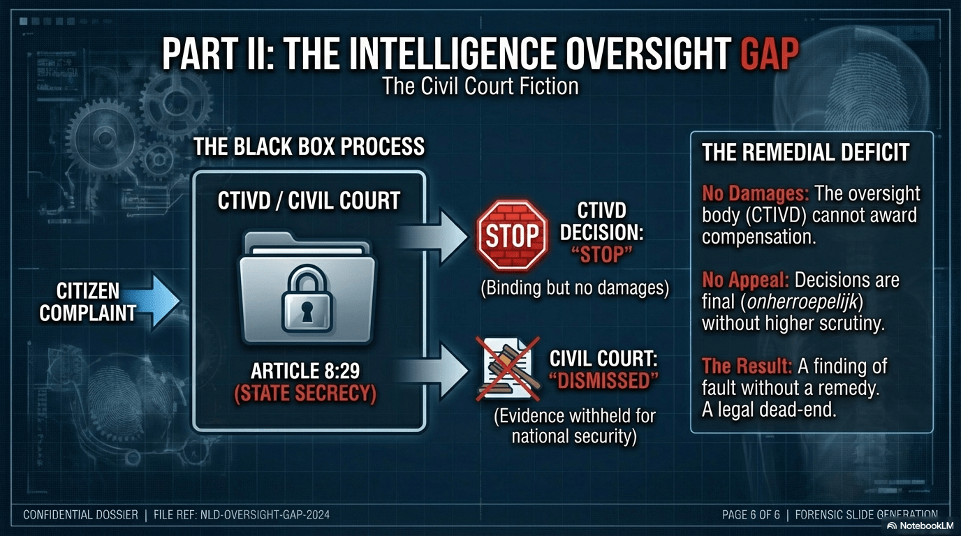 This “Civil Court Fiction” is a formidable barrier. A civil judge does not have the same access to classified files as the CTIVD. The state can invoke Article 8:29 of the General Administrative Law Act to withhold the very evidence needed to prove the tort on national security grounds. Thus, the system provides a finding of fault without a remedy for the damage. The victim is left with a piece of paper saying “you were right,” but no means to rebuild their life.