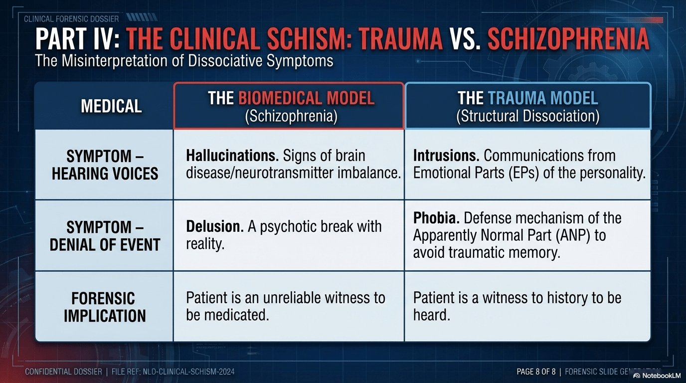 “Ignorant” psychiatrists, trained in the biomedical model, often misinterpret these dissociative phenomena as psychotic symptoms. They view “voices” as hallucinations caused by brain disease (neurotransmitter imbalance) rather than fragments of a traumatized self. By diagnosing Schizophrenia or Delusional Disorder, they fundamentally delegitimize the patient’s narrative. They treat the story as the symptom to be medicated away, rather than the evidence of a crime to be investigated. This is the “ignorance” the user refers to: a willful blindness to the etiology of trauma.4