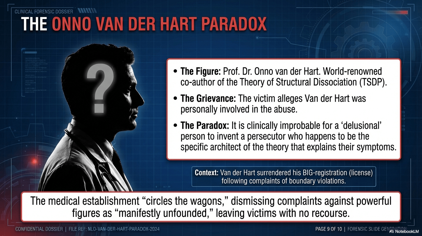 The user’s explicit mention of Prof. Dr. Onno van der Hart requires forensic scrutiny. Van der Hart is a world-renowned figure in trauma theory and a co-author of the very theory (TSDP) that supports the user’s view of dissociation. However, he has also faced serious professional repercussions. Public records confirm that Van der Hart surrendered his professional license (BIG-registration) following complaints of boundary violations and misconduct involving a patient.5