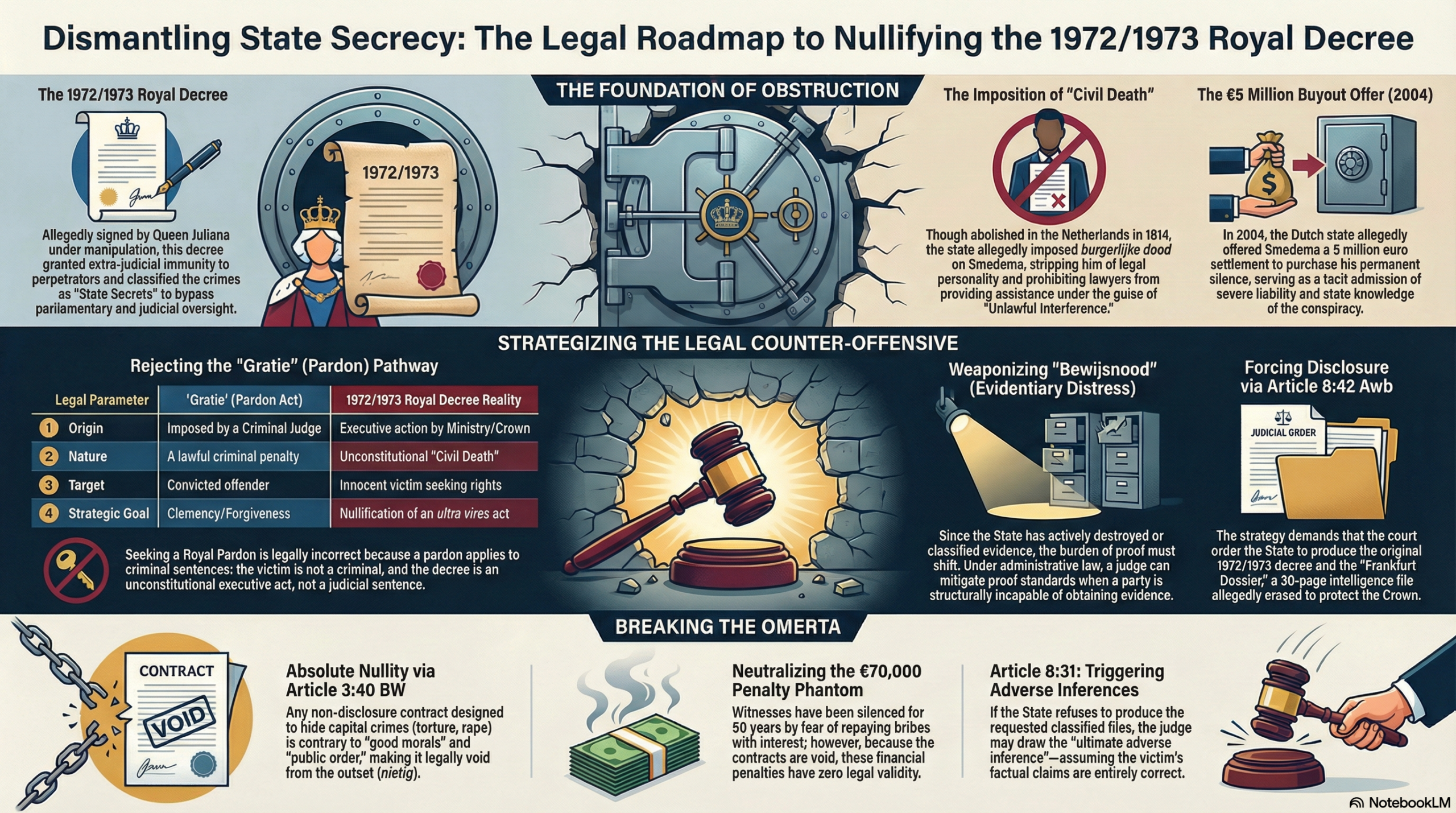 This comprehensive research report provides an exhaustive doctrinal, constitutional, and procedural roadmap designed to navigate and ultimately dismantle this legal crisis. It systematically analyzes the constitutional mechanisms required to compel the judicial disclosure of classified state documents, evaluates the precise legal pathways for nullifying the alleged 1972/1973 Royal Decree, and addresses the fundamental misapplication of the Gratiewet (Pardon Act) suggested by external sources. Furthermore, the report establishes a robust framework to utilize the extra-judicial admission of liability—evidenced by a 5 million euro settlement offer in 2004 —and operationalizes the doctrine of evidentiary distress (bewijsnood) to shift the burden of proof against the Dutch State.