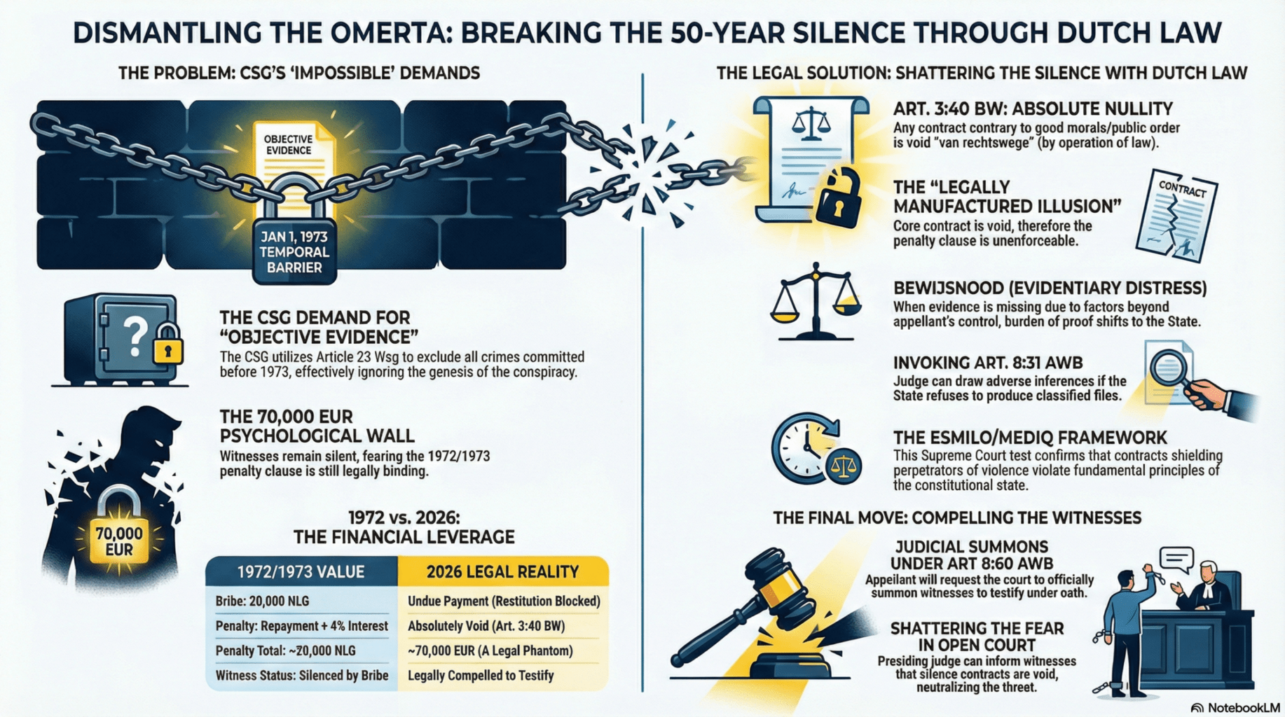 The invocation of the 1972/1973 Omerta contract is the ultimate proof of bewijsnood. The appellant’s argument is overwhelmingly potent: He is not failing to provide evidence; rather, the evidence has been systematically blockaded by a coordinated, well-funded criminal enterprise operating under the guise of civil non-disclosure agreements. The witnesses exist, the memories exist, but they are locked behind a psychological wall of financial terror created by the 70,000 EUR penalty threat.1 The CSG’s dismissal of the appellant’s overmacht (force majeure) argument by simply stating it was “not substantiated” 1 is a circular fallacy; he cannot substantiate the obstruction because the obstruction itself prevents him from gathering the substantiation.