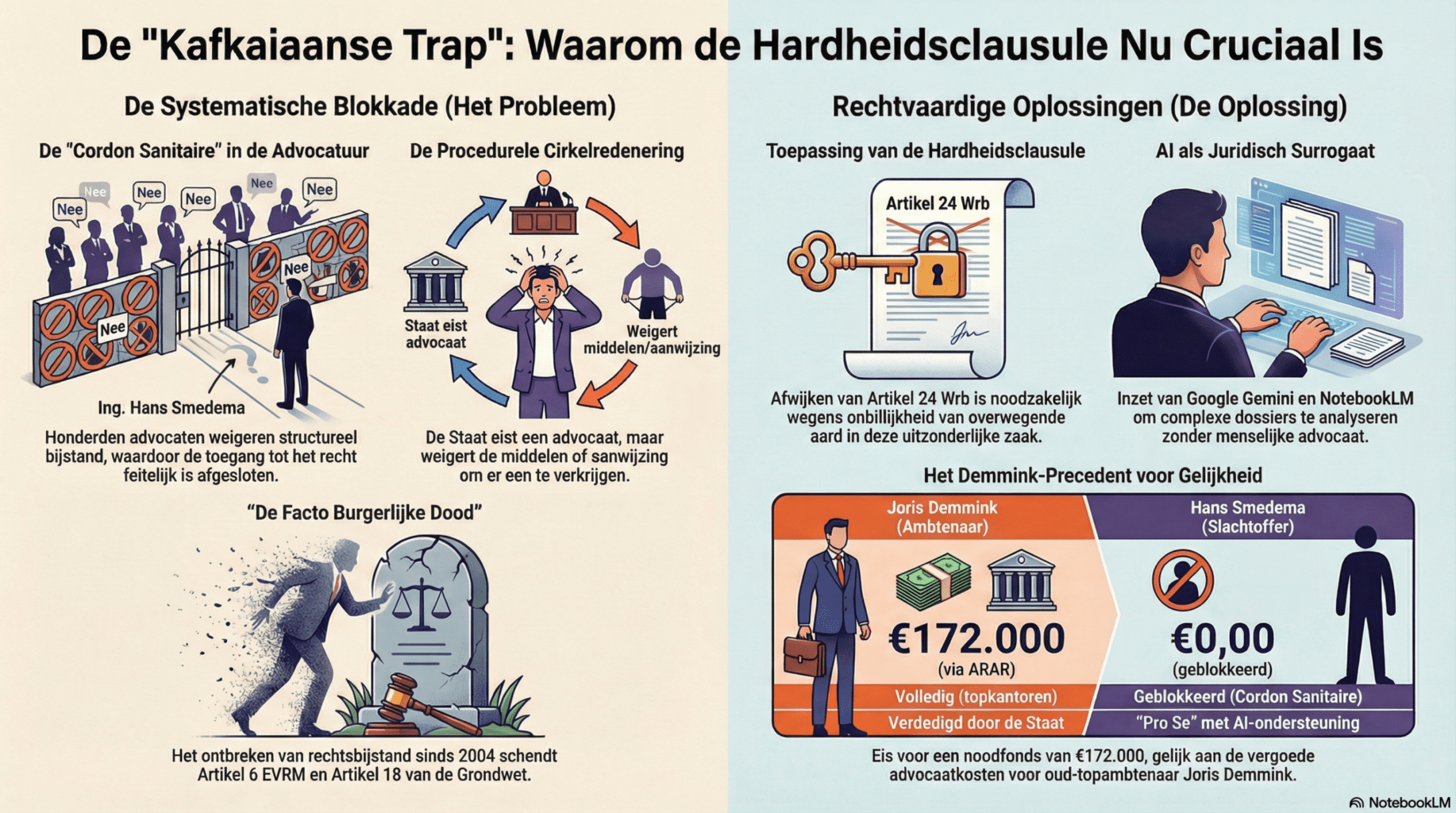 Sinds 2004 verkeert indiener in een “Kafkaiaanse trap.” De Staat en de Nederlandse Orde van Advocaten hebben een feitelijke blokkade (een “cordon sanitaire”) opgeworpen die het onmogelijk maakt voor indiener om een advocaat te contracteren.1