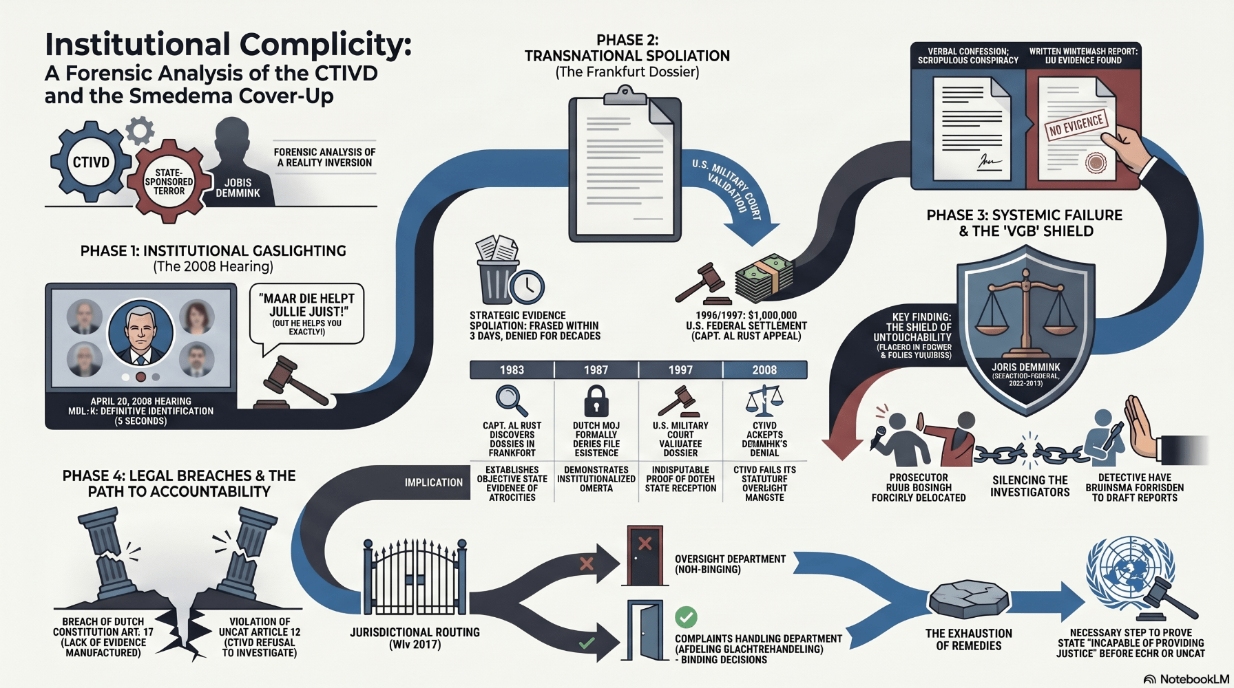 By choosing to accept Joris Demmink’s demonstrable lie over the verified findings of a United States Military Court, the CTIVD willfully blinded itself to transnational forensic evidence. The U.S. settlement represents an unassailable judicial finding that proves the Dutch State systematically deletes records to protect high-level predators and maintains an institutional cover-up of fraud.4 A domestic oversight body cannot legally claim a “lack of evidence” to deny victim reparations when a foreign federal tribunal has already verified that the Dutch state aggressively and illegally destroyed that exact evidence.4 The CTIVD’s refusal to acknowledge this reality renders them an active participant in the obstruction of international justice.