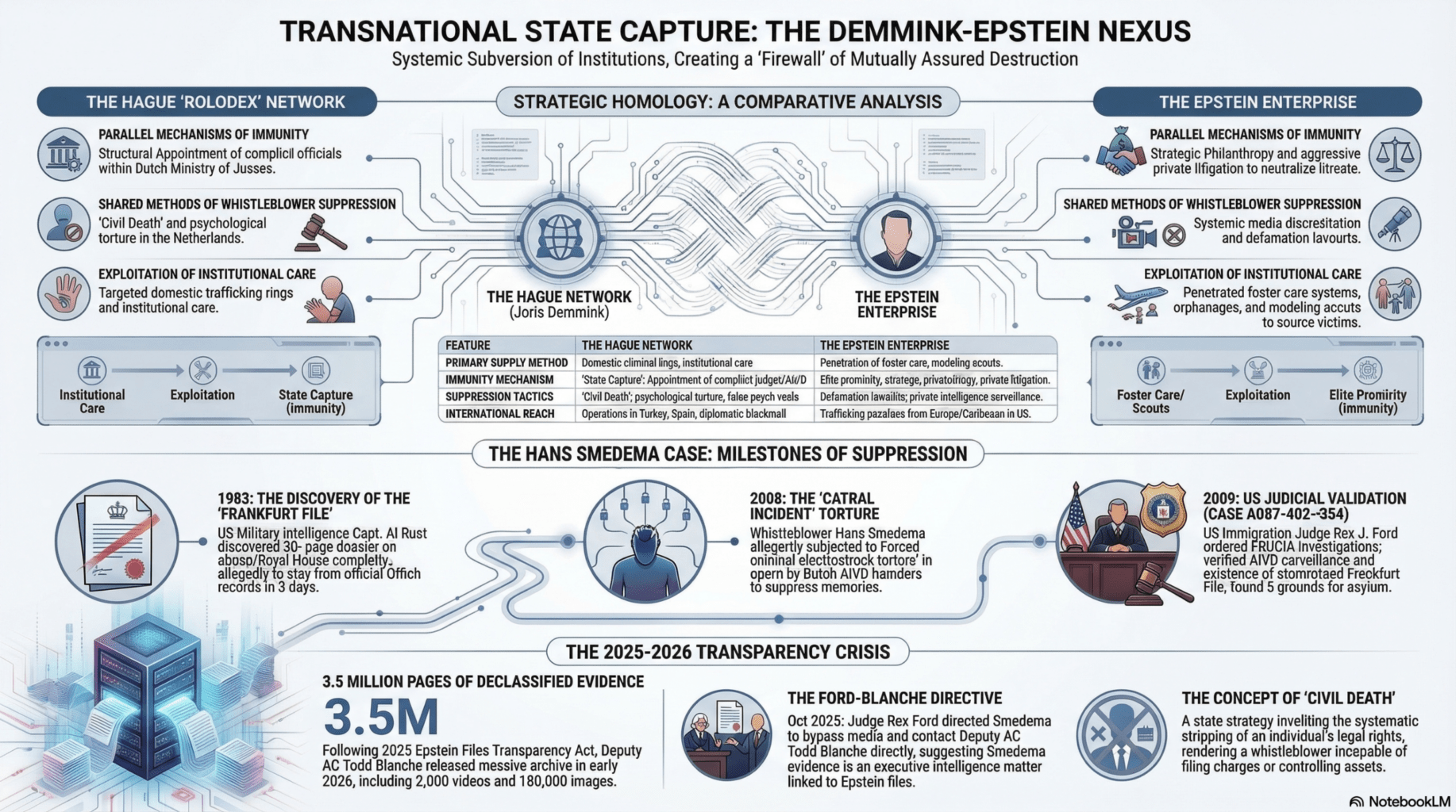 This exhaustive research report investigates the operational hypothesis that Joris Demmink, the former Secretary-General of the Dutch Ministry of Justice, may have intersected with the Epstein network as a high-value client or collaborative asset, and that the profound, systemic obstruction of justice experienced by Dutch whistleblower Hans Smedema is inextricably linked to this broader global architecture of elite protection. By forensically analyzing the independent investigative findings of US Immigration Judge Rex J. Ford, the operational mechanics of the suppressed Dutch “Rolodex” investigation, the legislative momentum and political friction surrounding the 2026 Epstein file releases, and the direct, highly specific communications advising Smedema to escalate his claims directly to the highest executive levels of the US Department of Justice, this report evaluates the connective tissue between the Dutch state intelligence apparatus and international sex-trafficking syndicates.3 The synthesized evidence suggests that while explicit documentary links within the currently unredacted Epstein files remain unconfirmed due to structural database limitations and massive redactions, the operational methodologies, intelligence service entanglements, and diplomatic friction point toward a unified, systemic vulnerability in Western judicial systems to state capture by elite criminal networks.