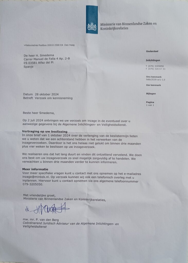 Hier de brief van mw. mr. P. van den Berg, Coördinerend Juridisch Adviseur van de Algemene Inlichtingen- en Veiligheidsdienst