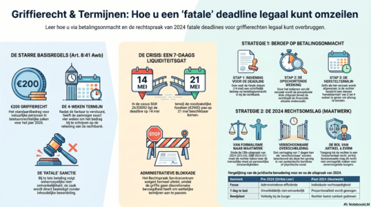 Ik verzoek u de betaling van het griffierecht ad € 200,-, welke ik gegarandeerd en uiterlijk op 21 mei 2026 zal overmaken (slechts 7 dagen na de initiële termijn), als tijdig en verschoonbaar te accepteren, dan wel de fatale termijn te stuiten via de behandeling van dit beroep op betalingsonmacht en mij een formele hersteltermijn te gunnen. Het is ondenkbaar dat in een rechtsstaat een slachtoffer de toegang tot de rechter wordt ontzegd vanwege een betalingsvertraging van een week, veroorzaakt door het falen van de door de staat gegarandeerde rechtsbijstand.