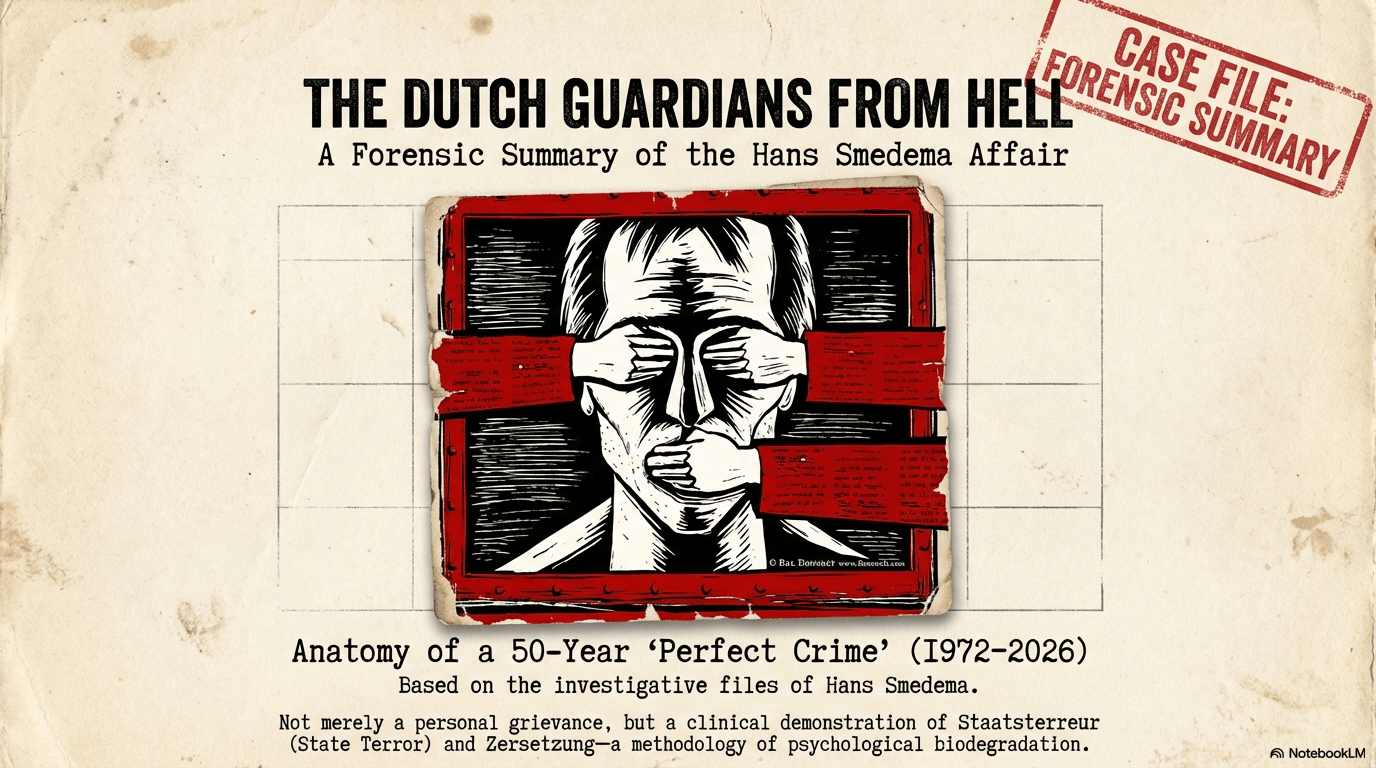 The “Hans Smedema Affair” constitutes a systematic and strategic collapse of the Dutch Rule of Law, evolving over fifty years from a series of foundational crimes into a sophisticated apparatus of institutionalized silence. This is not merely a personal grievance; it is a clinical demonstration of Staatsterreur (State Terror) and Zersetzung—a methodology of psychological biodegradation designed to dismantle a citizen’s professional and private existence. For the human rights observer, this summary serves as a forensic autopsy of a multi-decade “Omerta” designed to render a victim “civilly dead.”