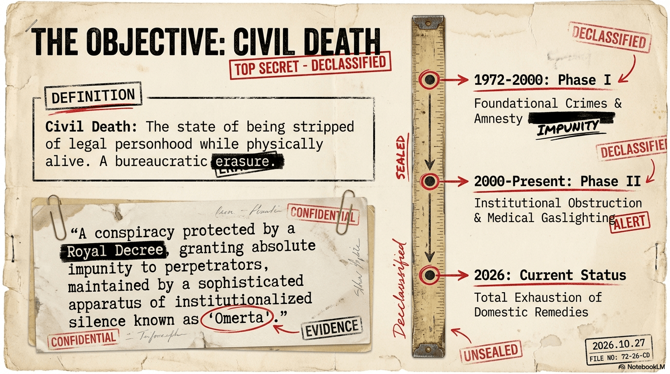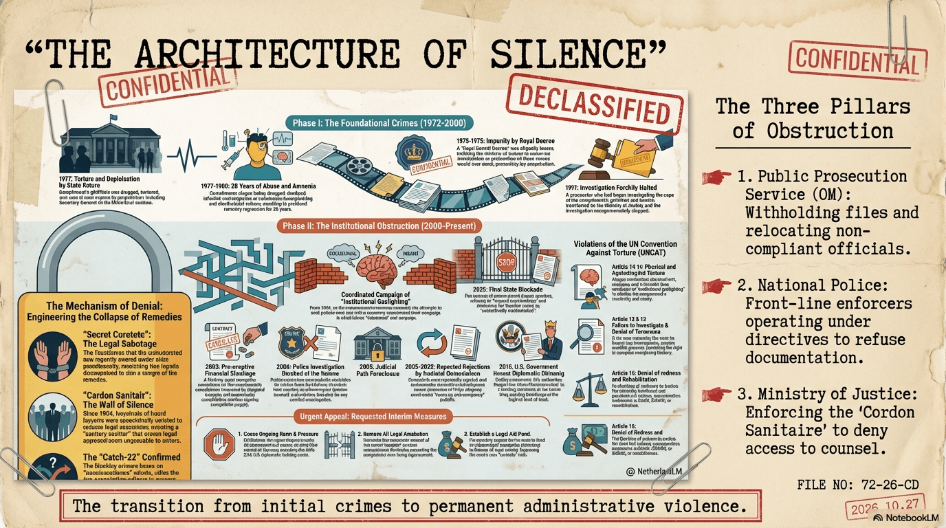 - Ministry of Justice: Utilized the 1972/73 Decree to enforce a “Cordon Sanitaire,” systematically denying the victim access to legal counsel and state-held evidence under the guise of national security.
