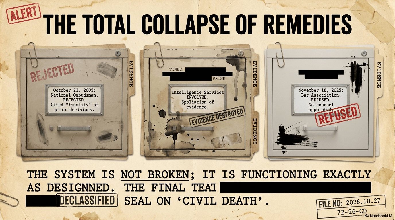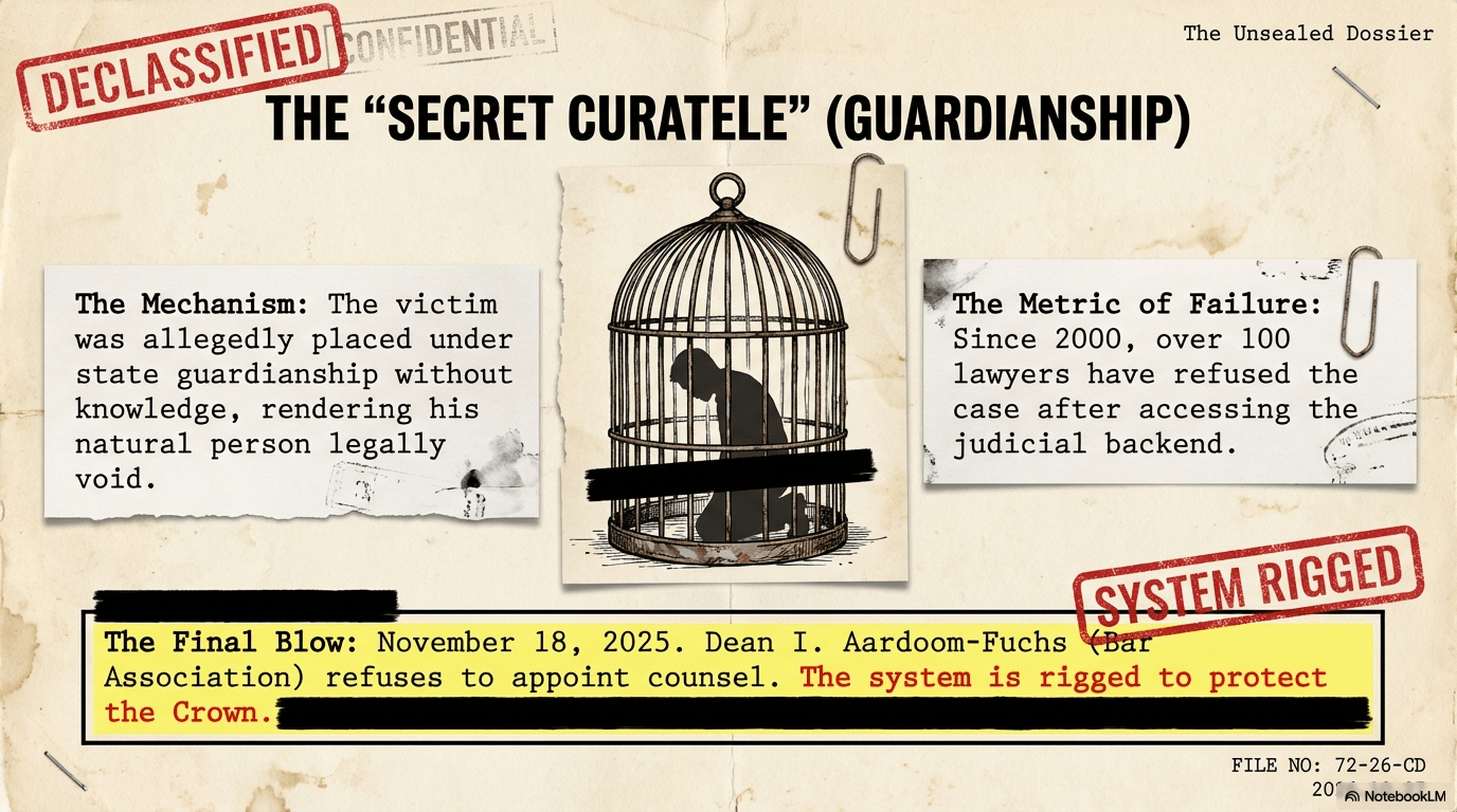The ultimate tool of the state is the “Cordon Sanitaire.” Since 2000, over 100 lawyers have universally refused the case after accessing the judicial backend, pointing to a “Secret Curatele” (Guardianship) that renders the victim’s natural person legally void. On November 18, 2025, Dean I. Aardoom-Fuchs of the Bar Association finalized this state of “Civil Death” by refusing to appoint counsel, confirming that the system is not broken, but rigged to protect the Crown.