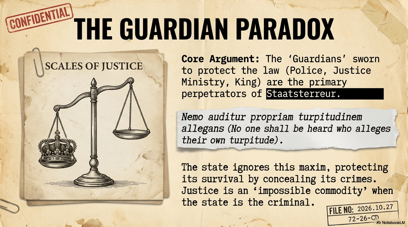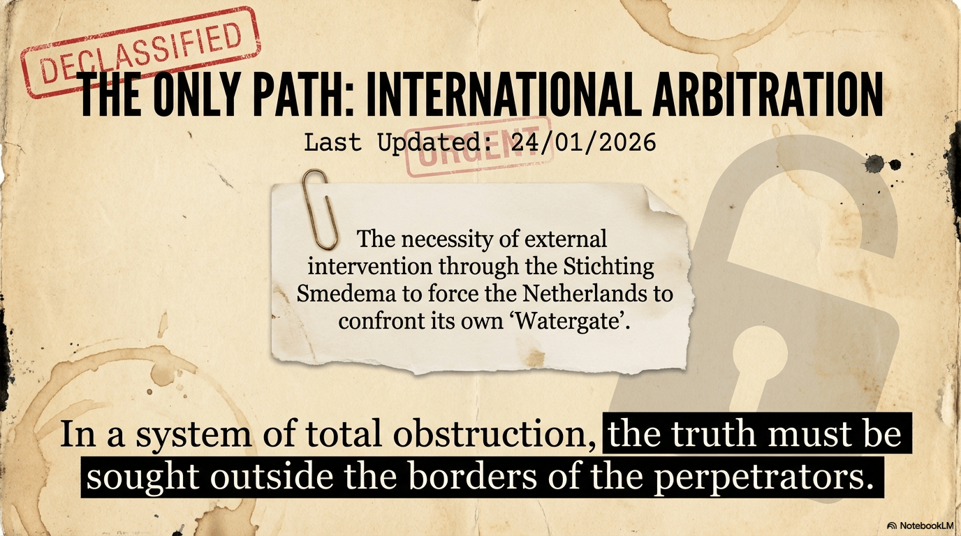 The Hans Smedema Affair presents a chilling paradox: the “Guardians” sworn to protect the law—the Police, the Ministry of Justice, and the King—have become the primary perpetrators of Staatsterreur. When the state identifies its own survival with the concealment of its crimes, justice becomes an impossible commodity. The only path to resolution is international arbitration through the Stichting Smedema Redress, a legal shell created to bypass the “Secret Curatele” and force the Kingdom of the Netherlands to confront its own “Watergate.” In a system where Nemo auditur propriam turpitudinem allegans is ignored, the truth must be sought outside the borders of the perpetrators.