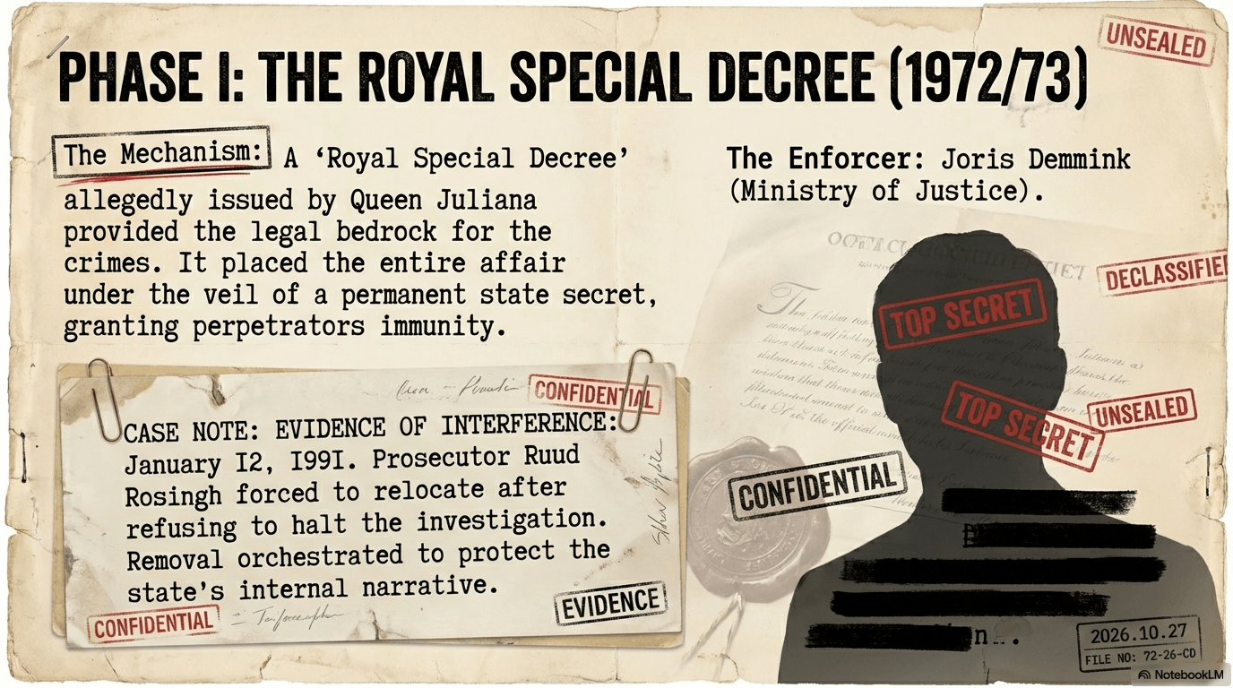 Central to this architecture is the “Royal Special Decree” of 1972/73, allegedly issued by Queen Juliana. This instrument provided the legal bedrock for the “Perfect Crime,” granting perpetrators absolute impunity and placing the case under the permanent veil of a state secret. The execution of this concealment was facilitated at the highest levels of the Ministry of (In)Justice, specifically through the influence of Joris Demmink. His administrative interference is typified by the forced relocation of Prosecutor Ruud Rosingh on January 12, 1991, after Rosingh refused to halt an investigation into the affair—a clear act of institutional sabotage to protect the state’s internal narrative.