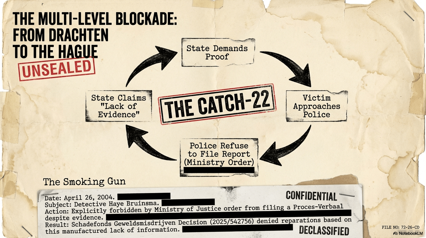 The core of the Smedema affair is a “Kafkaesque Trap” where the state demands proof while simultaneously ensuring its destruction. The foundational act of this suppression is the denial of a Proces-Verbaal (official police report). This blockade was formalized on April 26, 2004, when Detective Haye Bruinsma of the Drachten Police was explicitly forbidden by a Ministry of Justice order from filing a report, despite being presented with clear evidence of crimes. This manufactured “lack of objective information” was directly cited in the Schadefonds Geweldsmisdrijven Decision (2025/542756) to justify the denial of reparations in late 2025.
