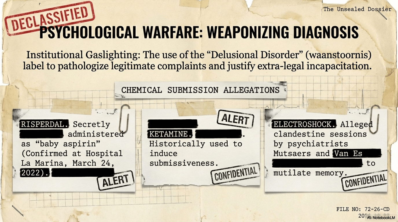When legal blockades are challenged, the state resorts to “Institutional Gaslighting.” The application of a “Delusional Disorder” (waanstoornis) label is a form of psychological warfare designed to pathologize legitimate complaints and void the victim’s legal standing. This diagnostic stalemate is maintained through “Chemical Submission,” including the secret administration of Risperdal (disguised as “baby aspirin”) confirmed at Hospital La Marina on March 24, 2022, and the historic use of Ketamine to induce submissiveness.