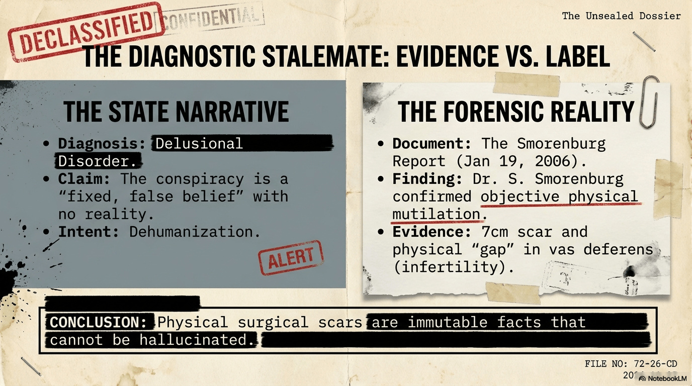 | Diagnosis: Claims the victim’s narrative of high-level conspiracy is a “fixed, false belief” with no reality. | Smorenburg Report (Jan 19, 2006): Dr. S. Smorenburg confirmed a 7cm scar and a physical “gap” in the vas deferens. |