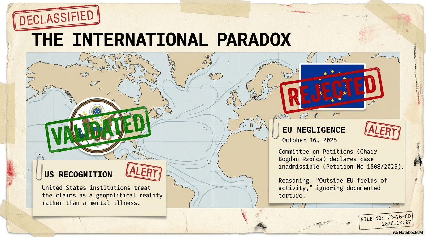 The affair reveals a staggering collapse of international oversight. On October 16, 2025, the EU Committee on Petitions (Petition No 1808/2025), chaired by Bogdan Rzońca, declared the case inadmissible, claiming it fell “outside the EU’s fields of activity”—ignoring documented torture and judicial fraud within a Member State. This followed years of “International Manipulation,” where the Dutch government provided false information to the ECHR in 2005/2006 to secure rejections based on the failure to exhaust domestic remedies that the state itself had blocked.