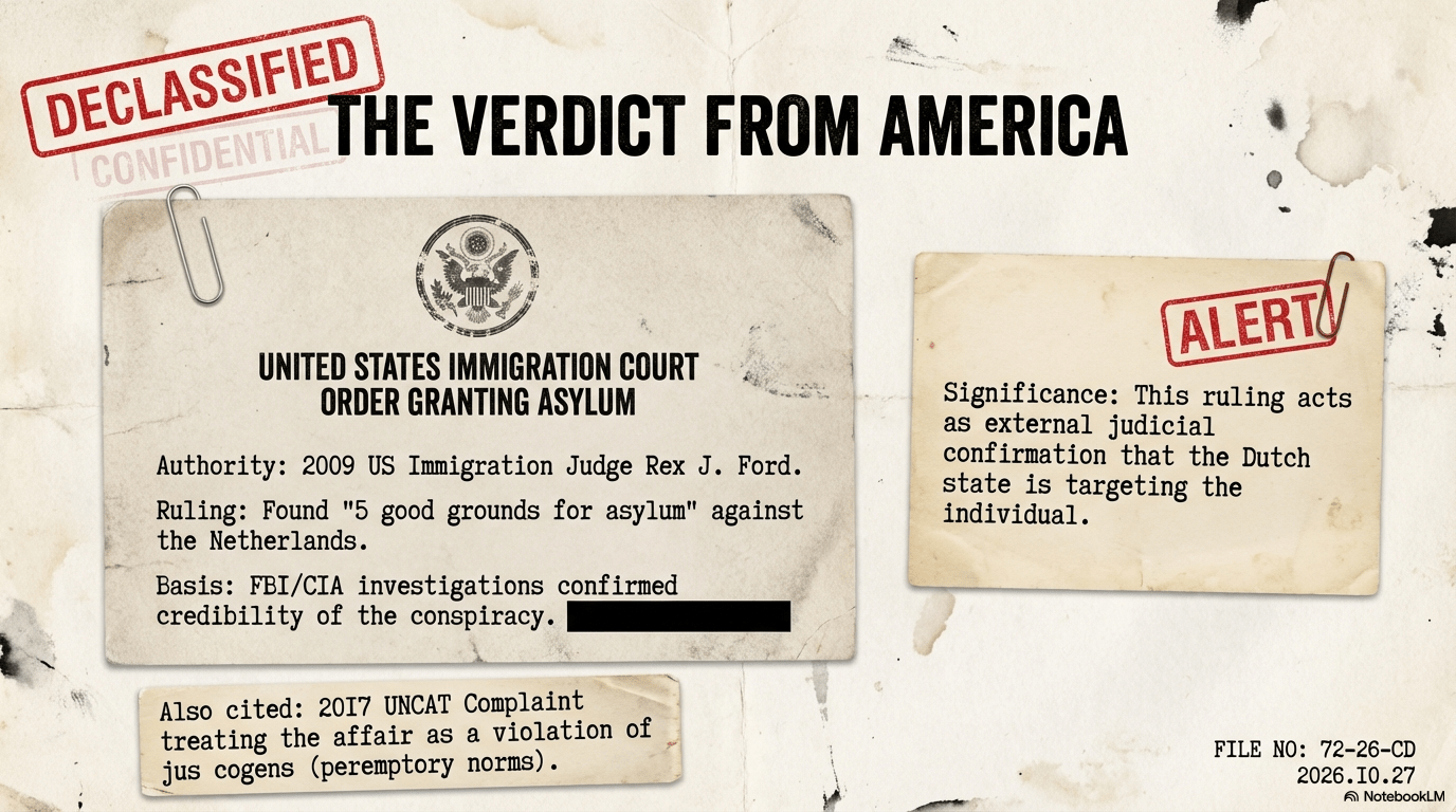 - 2009 US Ruling: Immigration Judge Rex J. Ford found “5 good grounds for asylum” against the Netherlands, a decision based on FBI/CIA investigations that confirmed the credibility of the conspiracy.